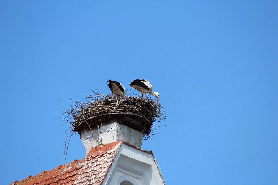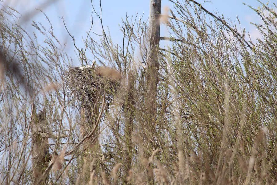 ![]() ![]() Schön verborgen ist das zweite Storchennest in Bad Buchau; das Paar hat die Aufgabenteilung voll übernommen: ein Partner auf der dem Nest nahegelegenen Wiese auf Futtersuche, ein Storch sitzt auf den Eiern und brütet. Mehrfach stand er / sie auf, um die Eier zu wenden.